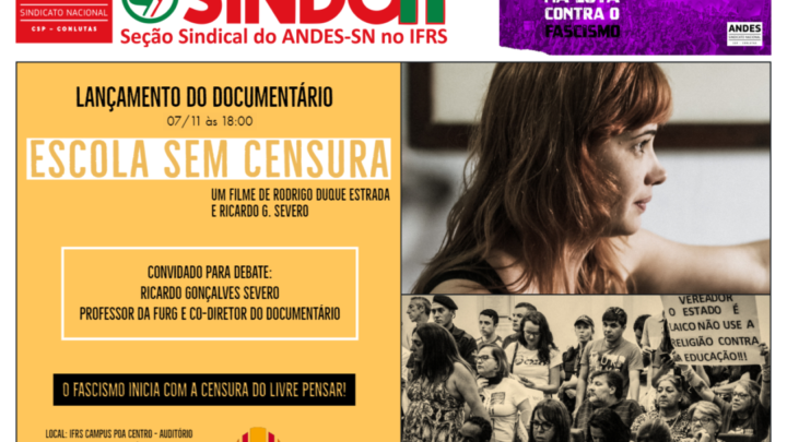 Em 07 de novembro no Auditório Rui Cruse (térreo) do Campus POA, a partir das 18h! Participe da exibição do documentário e do debate sobre a mordaça nas escolas. Venha se somar ao combate ao discurso da “ideologia de gênero” e enfrentar a restrição a livre manifestação docente no espaço educativo. Com a presença de…